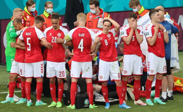 这一幕,不禁令人想起了3年前的欧洲杯上那类似的一幕:2020欧洲杯小组赛B组首轮丹麦与芬兰的比赛上半场临近结束前,埃里克森在没有任何身体对抗的情况下突然倒地昏迷,现场急救时,丹麦球员们用自己的身体将埃里克森团团围住。